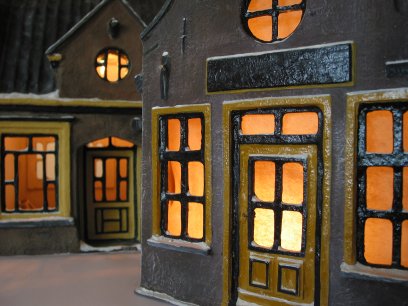 Kersthuis oude stijl, een fragment van de voordeur en het raam. Dit huis is gemaakt door cursist Sylvia, de raampjes zijn getekend naar haar eigen ontwerp.